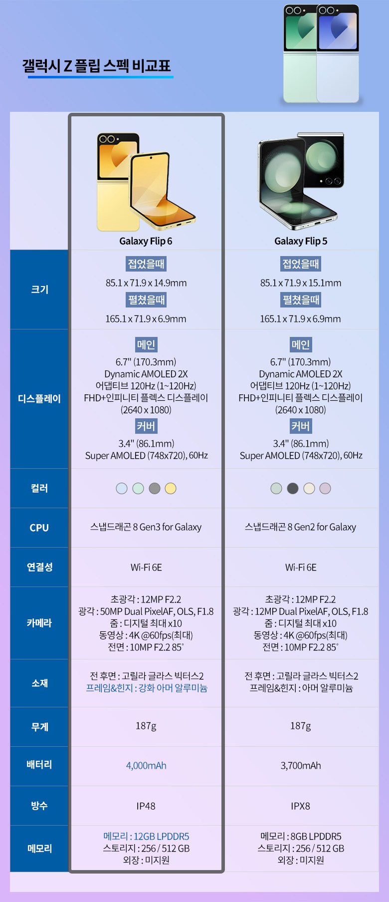 3. 배터리: Z 플립6는 3,700mAh로 Z 플립5의 3,700mAh와 동일하지만, 더 효율적인 프로세서로 배터리 수명이 개선되었어요.